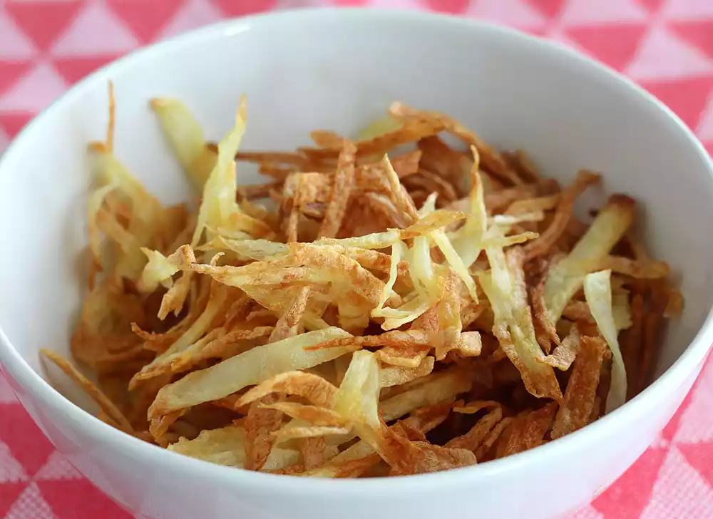Pela la patata, córtarla en rodajas muy muy finas (puedes ayudarte de una mandolina o laminador). A continuación, córtalas en bastoncitos.